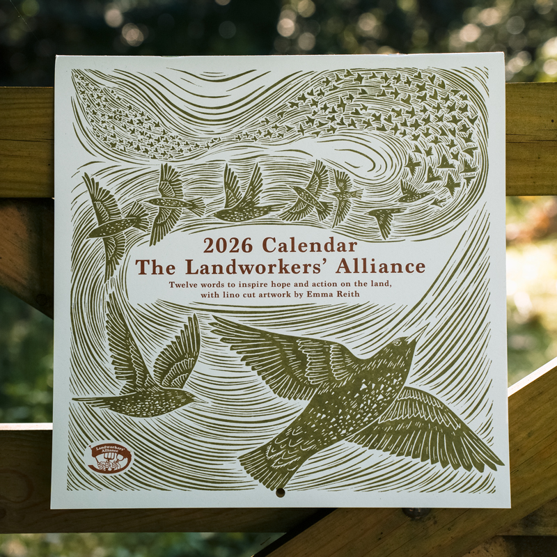 As ever, this year’s calendar has been a labour of love. The brilliant Emma Reith has brought the coming year to resplendent life through her stunning lino-cut prints. Each of her moving images is intimately tied to one of twelve words, chosen to inspire hope and action on the land.
